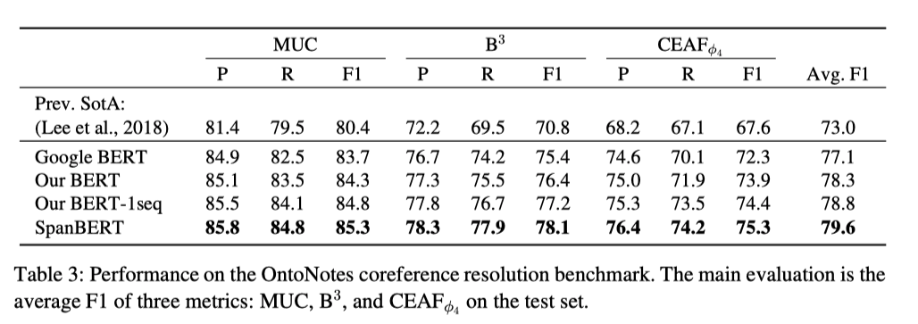 在共指消解任务上,SpanBERT的表现力压Google BERT和原BERT,拥有着最好的效果。