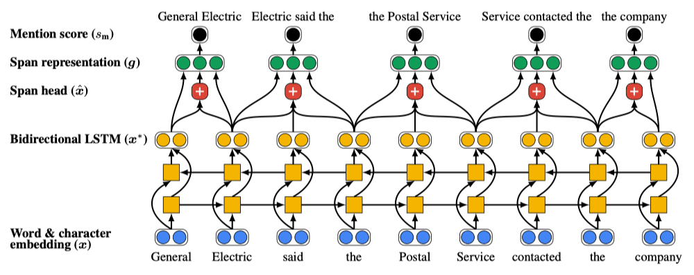 每个span的嵌入向量包括两部分:使用Bi-LSTM提取的span所在句的context信息;使用Attention提取的Span内部的关键词信息;如下图所示。