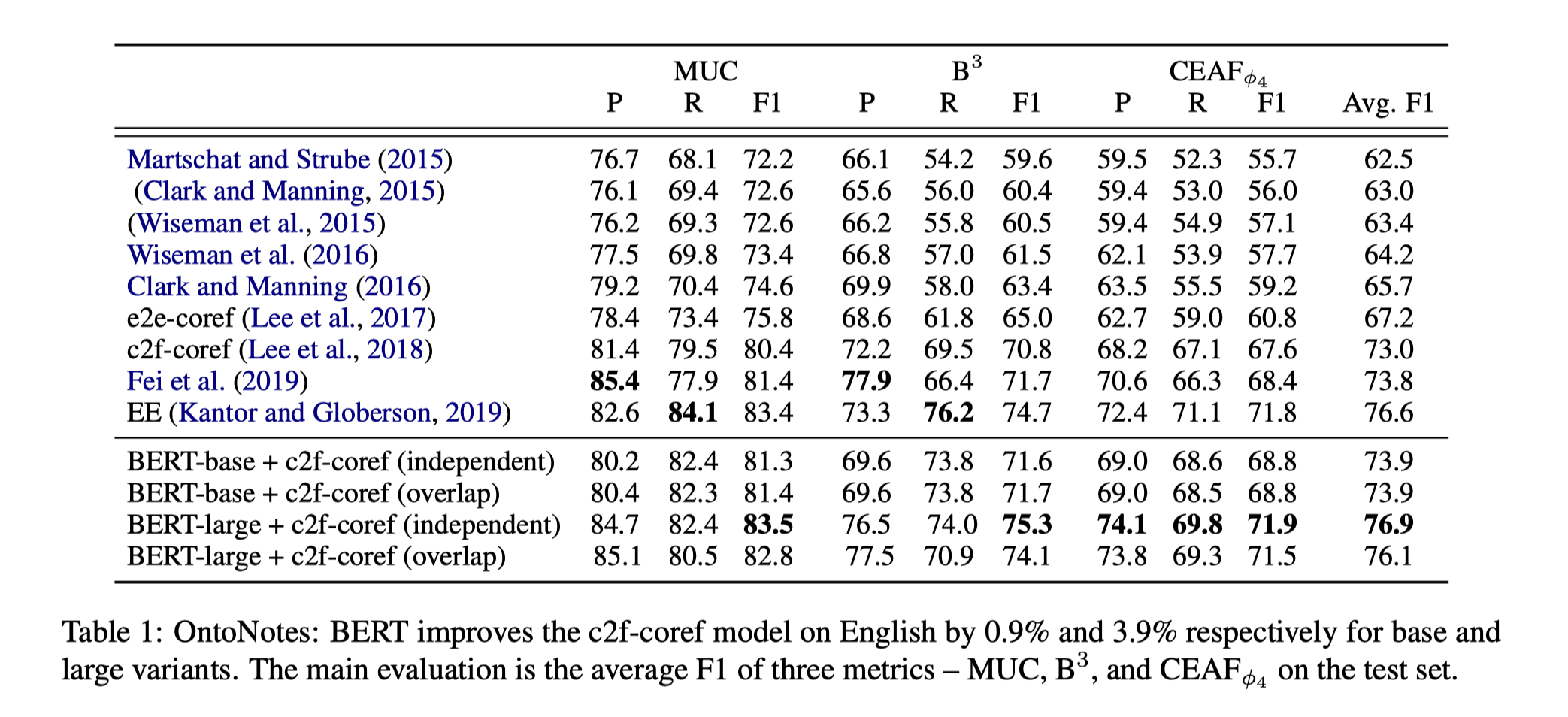 可以看到BERT-large+c2f-coref(independent)的模型表现是最好的。