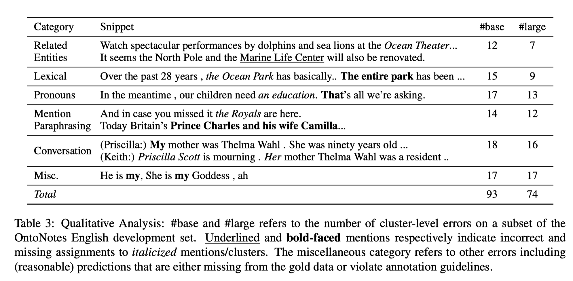 由上图可以看到对于Related Entities(同义实体)和Lexical(语法相关)类型的共指推理,BERT-large模型表现的更出色,犯了更少的错误。在Pronouns(代词)类型的共指推理上,BERT-large模型表现稍好一些,而在Mention Paraphrasing(表述释义)、Conversation(对话)和Misc.(复杂情景)下,BERT-large模型与BERT-base模型都很难处理。