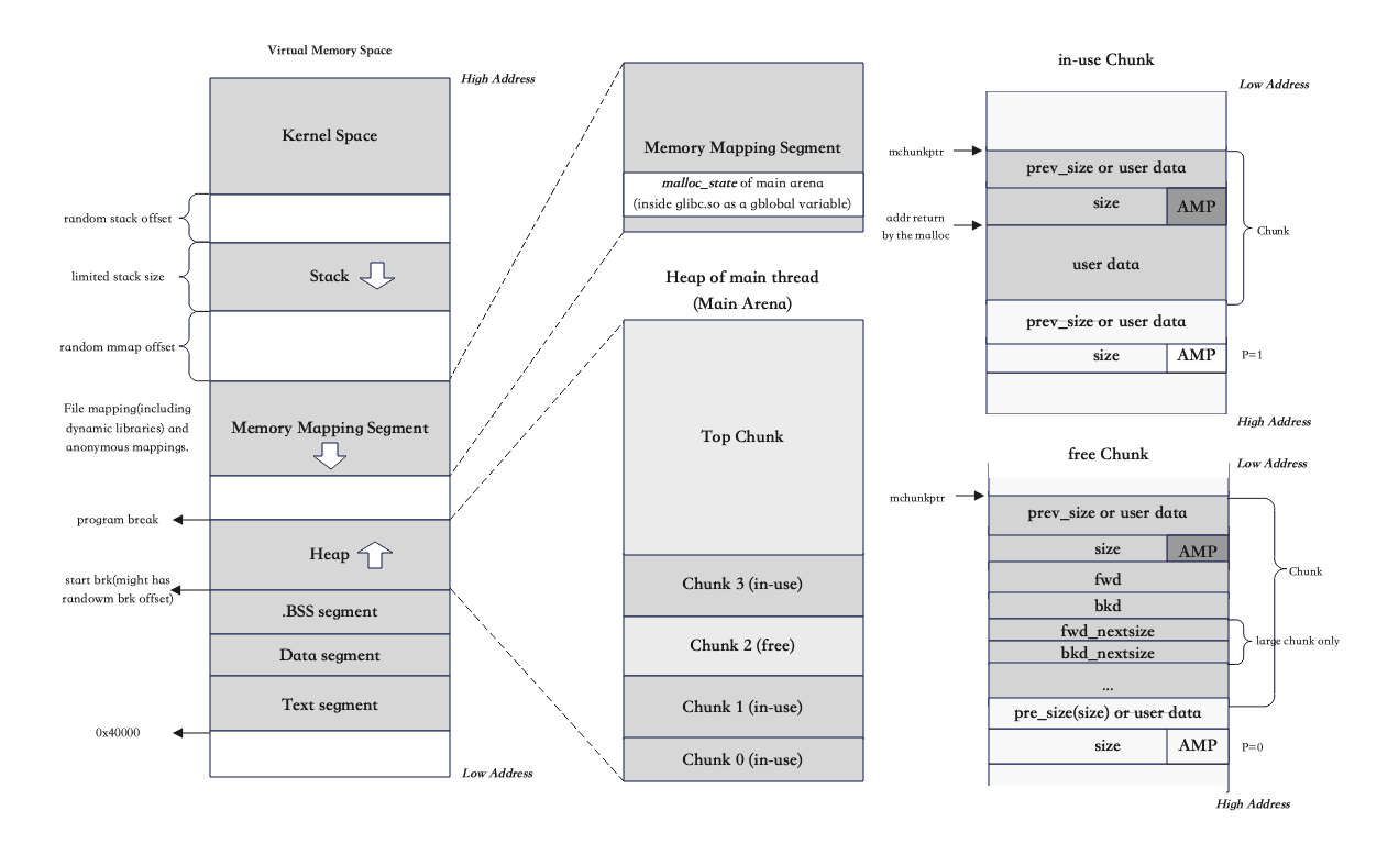 I really like the saying shown above. The word Heap we always use refers to the dynamically allocated segment in the virtual memory space of a process, but it actually stands for the implementation of the memory pool(the dynamic memory allocator) behind, which is quite complex and maybe vary on different machines, thus giving us a chance to exploit it. Here I am going to explain the important concepts of Heap and use the ptmalloc in the Glibc 2.31 library as an example.