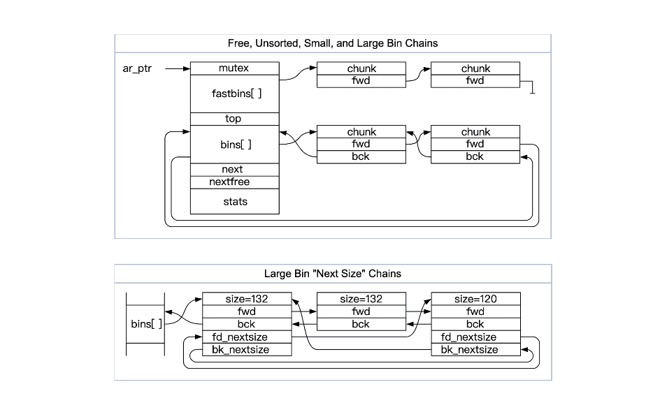malloc_stateheader structure. This structure tells the allocator where the top chunk (chunk at the highest address), last remainder chunk, bins, etc. are.