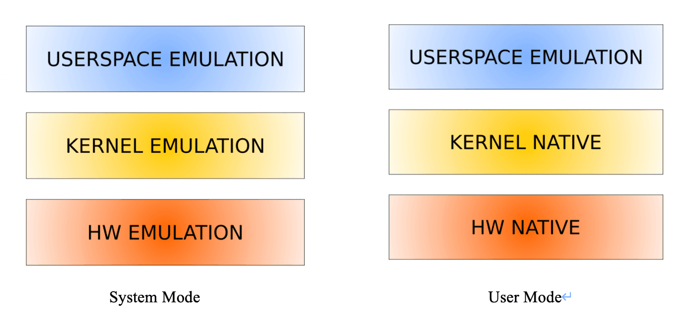 我们知道作为一台虚拟机,会将虚拟的硬盘加载到操作系统中,并与虚拟的硬件设备如CPU、键盘、网络调制器等进行交互。我们所编写的程序会通过系统调用与系统提供的键盘、终端、屏幕、文件系统等进行交互。也就是说,一个程序是在用户空间进行执行,而通过系统调用请求内核与计算机系统中的其他部分进行交互的。在用户模式中,QEMU并没有模拟硬件设备而只有CPU。它通过模拟的CPU来处理其他架构下的指令,然后传递(Capture and forward)系统调用到宿主机的内核。这就是为什么用户模式下的QEMU只能叫系统调用的虚拟,因为其根本没有虚拟内核而是用的宿主机的内核。QEMU的系统模式和用户模式的对比图如下所示。这篇博客讲的很好,可以参考一下。