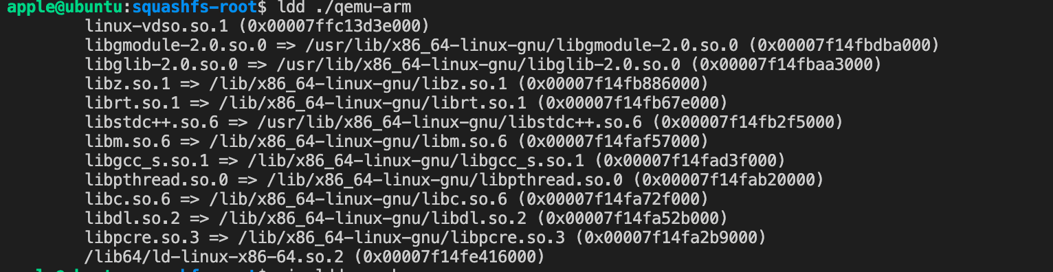 其实chroot: failed to run command ‘./qemu-arm’: Not a directory这条报错并不准确,可能造成的原因有很多。我们已经将qemu-arm复制到根文件系统下了,所以有可能是缺少依赖的动态链接库文件,毕竟qemu-arm是依赖的linux下的/lib或者/usr/lib下的动态链接库文件,chroot之后肯定找不到了呀。使用ldd命令查看qemu-arm依赖的动态链接库文件,然后复制进根文件系统。