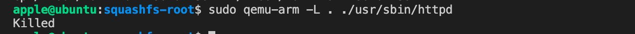 qemu-arm -L . ./usr/sbin/httpd即可。但是执行后发现程序并没有报错,而是运行了很久直接被killed了。