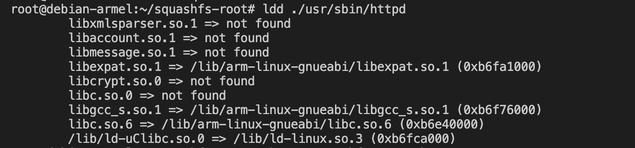 首先采用第一种方法。我们在squash-root目录下,执行qemu-arm的命令。如果不加-L参数,会提示/lib/ld-uClibc.so.0: No such file or directory报错,也就是./usr/sbin/httpd所依赖动态链接库文件找不到。在qemu的系统模式下查看httpd所依赖的动态链接库如下所示。
