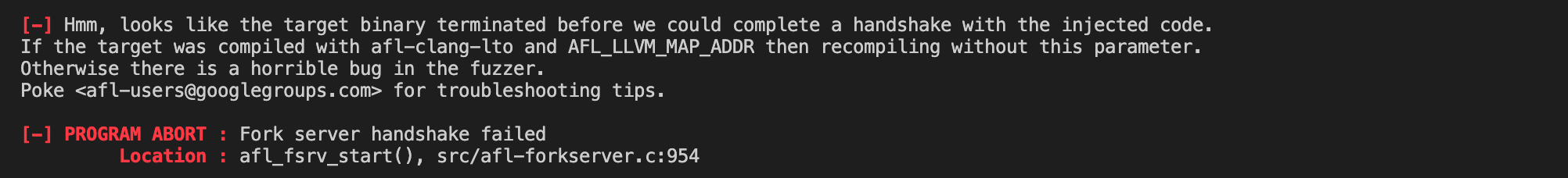 [-] PROGRAM ABORT : Fork server handshake failed报错,这里提供两个解决思路。一是检查环境变量,确保afl-showmap以及qemu-mode+参数L的方式可以正常运行该二进制程序。第二个是fuzz_out文件夹是通过该命令生成的,不需要提前建立,如果afl-fuzz在执行时发现目标输出文件夹已经存在,也可能会导致该错误。