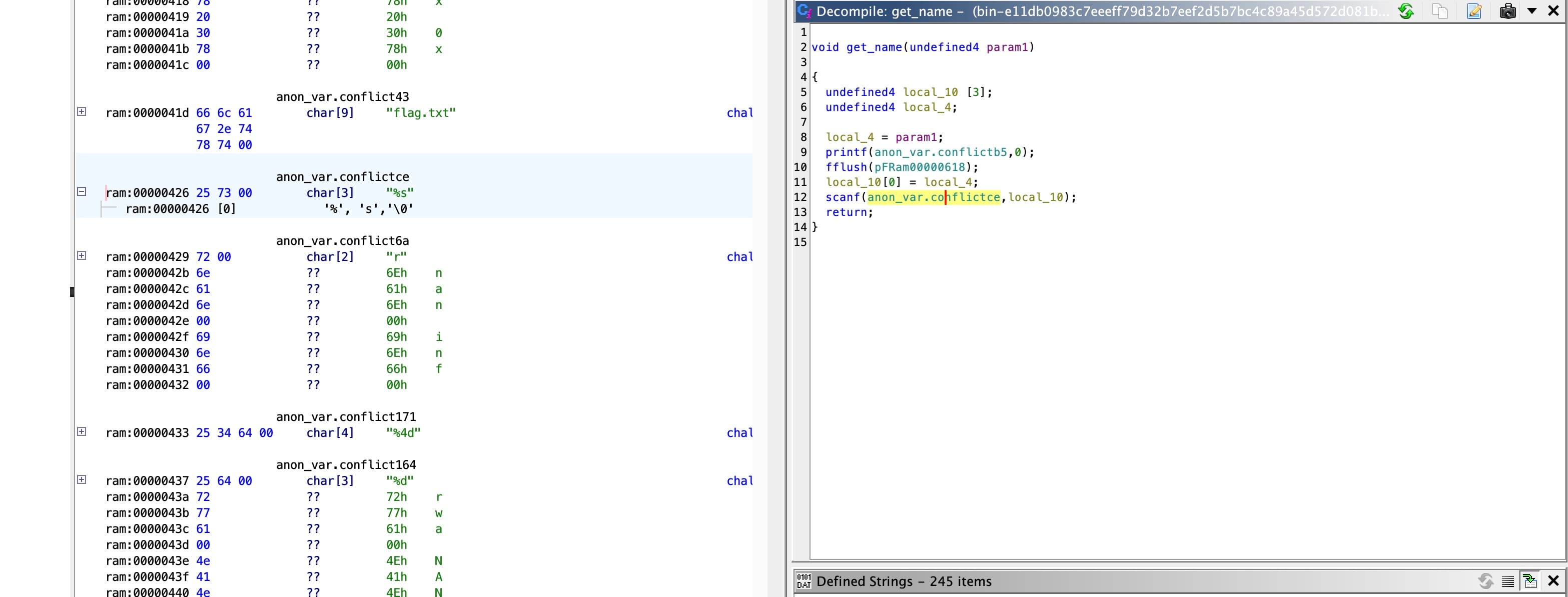 In the get_name function, there seems a buffer overflow vulnerability in the decompiled C code.